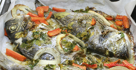 Etiketler : ana yemek tarifleri, fırında pişirilen yemek tarifleri, havuç , tane karabiber, limon, zeytinyağı, defne yaprağı, maydanoz, kuru soğan, fırında levrek balığı, levrek, balık yemekleri