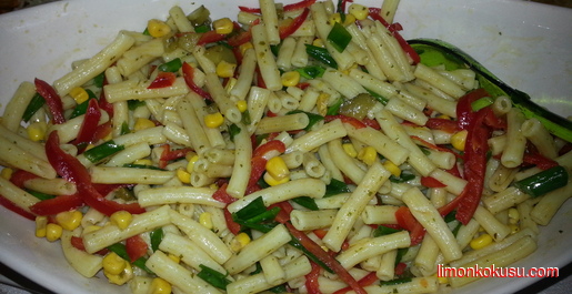 Etiketler : salata tarifleri, salatalık turşusu, mısır, pul biber, kuru nane, zeytinyağı, taze soğan, limon suyu, kırmızı biber, makarna salatası, makarna , yeşil biber, sarı biber