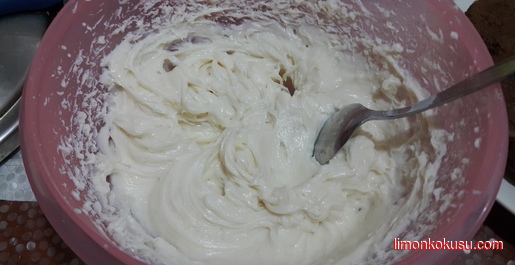 Kek hamuru fırında pişerken bu arada kremasını hazırlıyoruz.Krem şanti hariç tüm malzemeyi sos tenceresinde karıştırıp pişiriyoruz.Pişen kremayı soğuyunca derin bir kaseye alıyoruz.İyice soğuyan kremaya toz krem şantiyi ekleyip mikser yardımıyla çırpıyoruz.